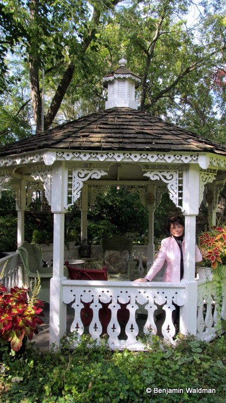 The gazebo, constructed in 1993 in honor of Marion and Michael’s 10th wedding anniversary, is designed using spokes Marion discovered in her attic