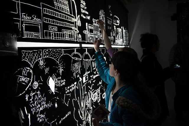 Upon entering, there’s background information on the beginning and evolution of the Lowline, conceived by James Ramsey of Raad Studio, and Dan Barasch. There’s also an audio component where people can listen to different perspectives and commentary about why the project is important. Downstairs there’s a small workspace for students, a wall for photos and feedback, and finally the Scratch Box, a canvas for the community to illustrate ideas.