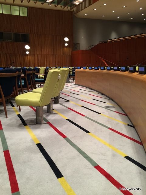The Trusteeship Council Chamber is a modernist dream, with lime-green chairs contrasting with the yellow, red and black stripes in the carpet, the teak paneling and the primary-colored box lighting, suspended from red horizontal ‘ladders’.