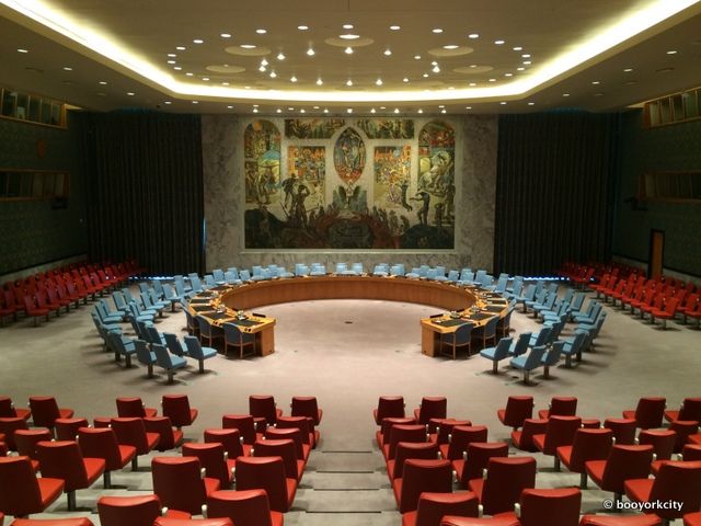 The Security Council Chamber is even more spectacular, and could pass for the War Room in Kubrick’s Dr Strangelove. Powder-blue, tomato red, and sage green seats face towards a center circle desk, backed by a vast mural by Per Krohg which is reminiscent of a church stained-glass window. It seems appropriate that this elegant, symmetrical space is where resolutions are made about world peace.