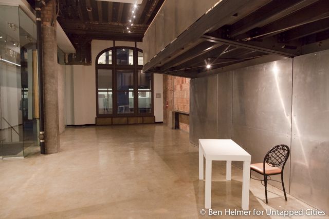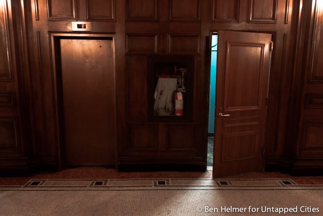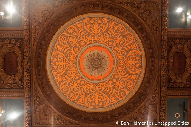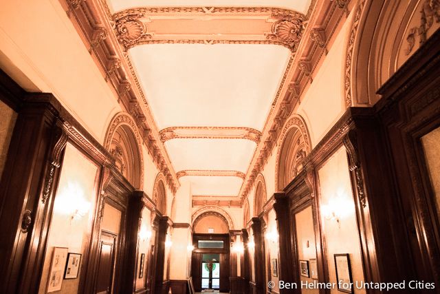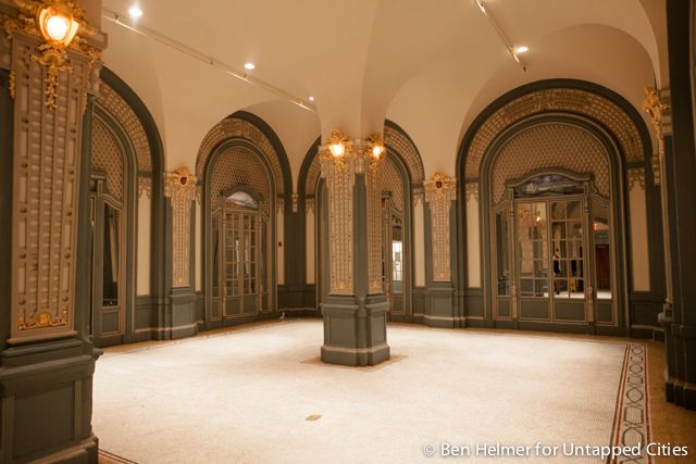 This room featuring stunning arched ceilings, warm orange illuminated sconces, and Rookwood fountain and murals by George Inness, Jr., was used as a building storage locker.