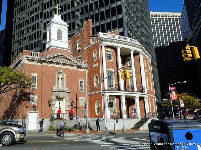 The Shrine of St. Elizabeth Seton is a notable reminder of post-revolutionary New York, when wealthy shipping merchants built a row of residences on State Street with the advantageous port and river views. Its curving portico adds detailing beyond a standard rectangular townhouse. The church is actually two houses while the lines of the portico are thanks to the nature of State Street itself. The slope of the street meant one house angled slightly to the front of the other, requiring the curved connector we seen today.