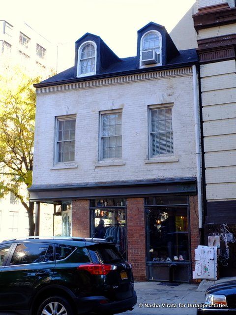 This humble three-storey white building can’t help but stand out on the corner of West Broadway and White Street beside the glassy skyscrapers and cast iron lofts/luxury apartments of Tribeca. While the building has inevitably undergone several renovations since it was built in 1809, the top two floors retains most of its historic character.