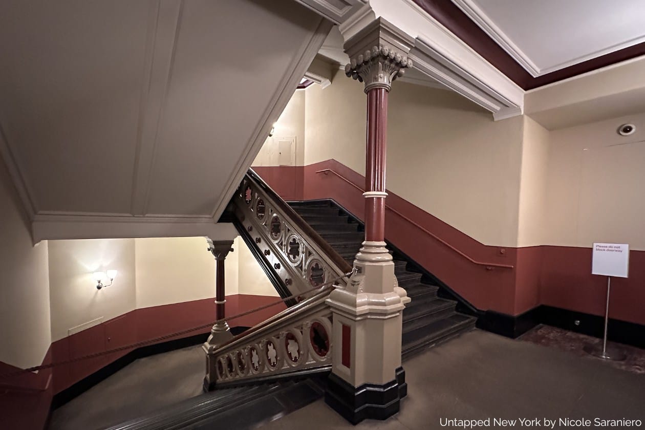 Two more evident remnants of the building can be found on either side of the Medieval galleries in the stairwells. These original staircases have ornate columns and railings that were repainted in Victorian colors in the 1990s.