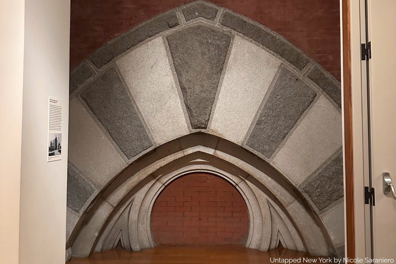 Another small portion of the Vaux and Mould building is tucked away at the top of the grand staircase in The Robert Wood Johnson Jr. Gallery. Go up the stairs and turn left, then look to your right at the start of the exhibit. This used to be a window facing Fifth Ave. The circular portion once filled with glass has been bricked in.