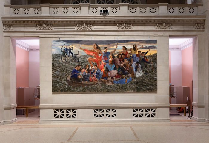 This debut installation, mistikôsiwak (Wooden Boat People), consists of two paintings—Welcoming the Newcomers and Resurgence of the People. The paintings hang inside The Museum’s Beaux-Arts Great Hall, the grand and ceremonial welcoming space designed by architect and founding Museum Trustee Richard Morris Hunt, where visitors have entered the museum since December 1902. Monkman’s work joins a Middle Kingdom statue of an Egyptian pharaoh—possibly King Amenemhat II (ca. 1919–1878 B.C.)—and a Hellenistic period sculpture of the Greek goddess Athena (ca. 170 B.C.)—both on long-term loan to the Museum. Previous installations have included work by Piotr Uklański (2015), Andy Warhol (2012), and John Baldessari (2010) as part of related exhibitions.