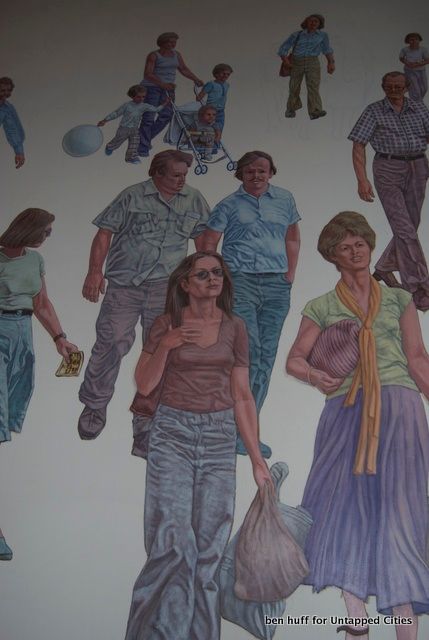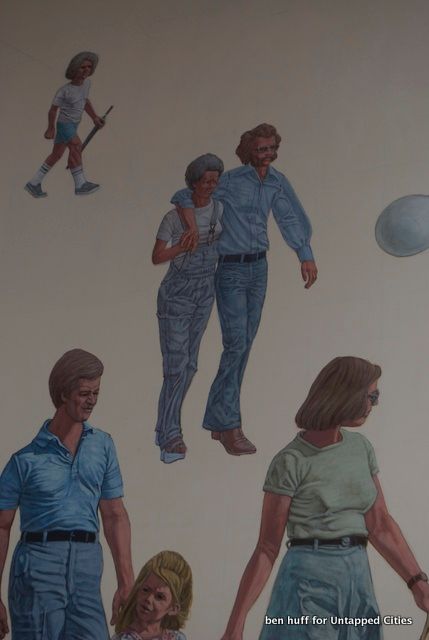 When I photographed the mural with Mr. Moran’s assistance, I was joined by a fellow church member. Cie Shepperson came to the church in the mid ’80s, almost a decade after the mural had been completed. She came with a friend because she heard they had good music at their services, and she was looking for a new church. Upon entering the hall she noticed the mural, and was quite fascinated by it. She nearly lost her breath however after recognizing a few people. On top of the section painted between the second and third window is the back of a women wearing a bright floral dress and reaching down to a young girl.