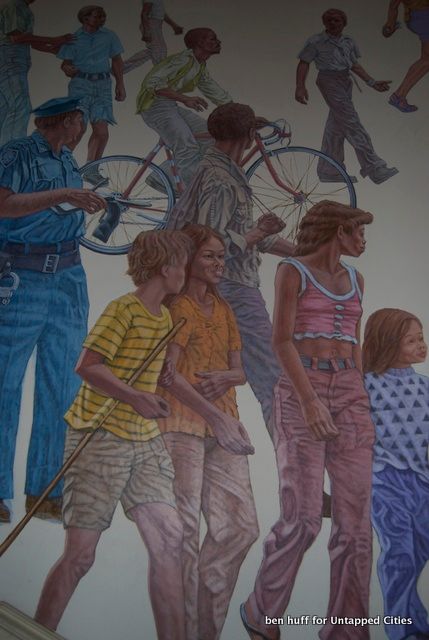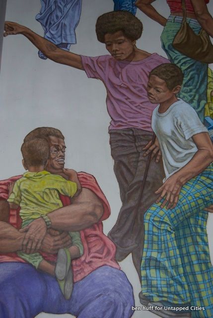 As I write this article almost 40 years after the mural’s completion, the neighborhood of Fort Greene, despite being landmarked, has changed significantly. Even the documentary that I came to the church to see lamented how much the neighborhood, especially nearby Fulton Mall, has changed to reflect new demographics and increasingly upper class residents that now inhabit the tree-lined brownstones. But this mural is a snapshot of the working class era of Fort Greene, and a testament to the people who sustained it for decades. To gaze upon it is to witness Cie Shepperson’s Fort Greene of 1975. A street scene of a typical hot, summer day, kids playing, people walking home from work, and police walking the beat. In the silence of the church you can almost hear them speak.