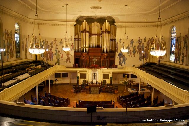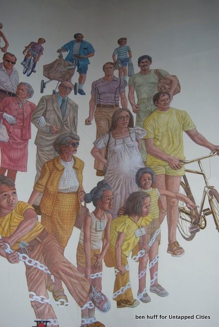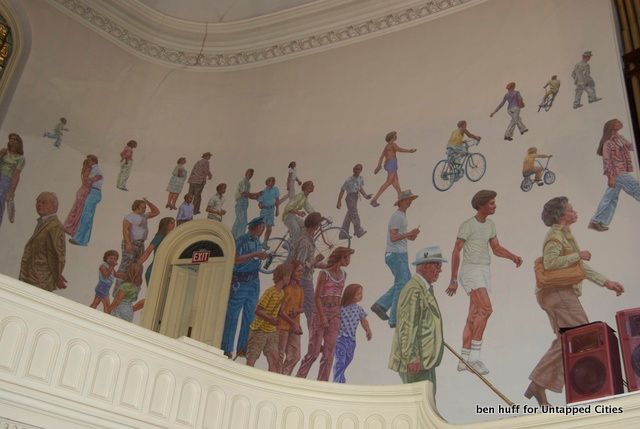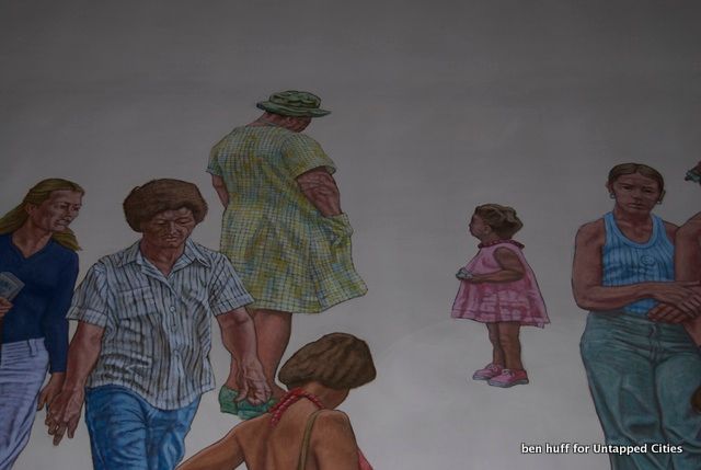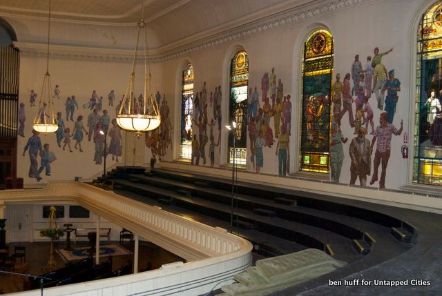 A few weeks ago I attended a screening of the new movie My Brooklyn at the Lafayette Avenue Presbyterian Church (LAPC) in Fort Greene. This strongly built Romanesque Revival church stands at the corner of South Oxford and Lafayette and is part of the Fort Greene Historic District. Immediately upon entering the main hall, I was struck by a mural that wrapped around the upper balcony. While so many churches have beautiful stained glass windows and large art depicting religious icons, this mural unassumingly displays completely normal people, wearing bell bottom pants, jeans and suits. The movie screening in its own right sparked considerable discussion, but I left the church with the need to know more about the mural I had just seen.