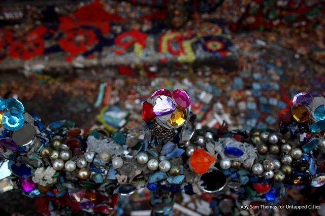 For instance, sitting on a pipe rising from the ground is a tiny pig amidst buttons, glass and beads. A brown and white butterfly rests on the fence, even as a dark black fly seems to feast on colorful gemstones. Look closely on the ground, and you will find fishes on tiles, sea shells, buttons, turquoise blocks and more. Raise your gaze a little, and also check out the beautiful gold leaves encrusted over the ledges of the windows of the house. Using colorful beads to spell out the message, the mosaic urges us to “celebrate life” and “celebrate love.”