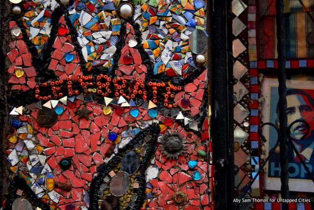 Located on 108 Wyckoff Street, the Mosaic House is easy enough to find in the midst of all the brownstones that are located on this tree-lined street. Because unlike the varying shades of brown that characterize the other homes on this block, this house has shards of crockery, colorful beads, round buttons, pieces of marble and more stuck on the outside of this otherwise unassuming house. It’s a brilliantly colored mosaic, with every glance at it bringing to the forefront some component that you may have missed before.