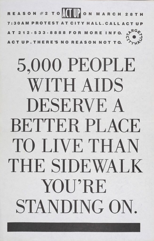 “Reason #2 to ACT UP on March 28th … 5,000 People with AIDS Deserve A Better Place to Live than the Sidewalk You’re Standing On” poster (1989). Image via Museum of the City of New York.