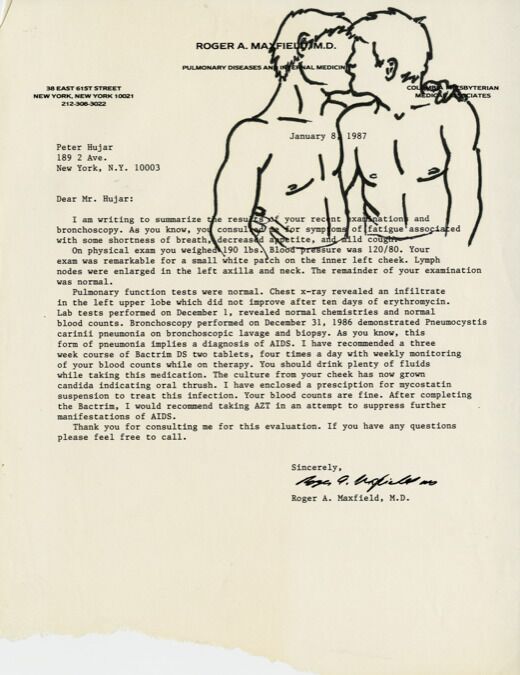 Peter Hujar’s diagnostic letter altered with a drawing of two men kissing. David Wojnarowicz (1987). Image via Museum of the City of New York.