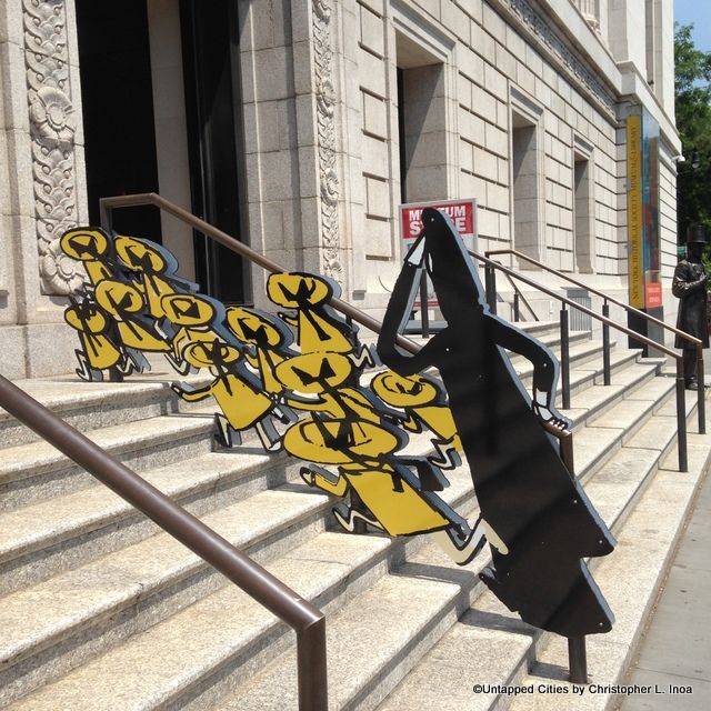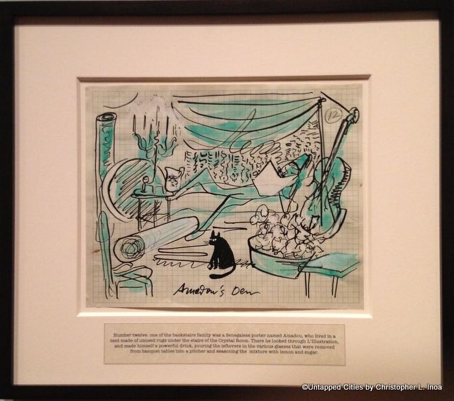 Before the Ritz Hotel was demolished in 1951, Town & Country magazine commissioned Bemelmans to write his memoirs inside his former place of employment. The result was not only a detailed book about his career, but also a series of drawings detailing the staff and residents of the Ritz hotel in its final days. The 21 drawings were all featured in the magazine and are on display inside the exhibit.