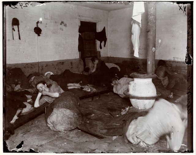 Pictured above is a typhus lodger, lying on the floor by the stove of the police station lodging house on Eldridge Street. Lodging house types ran the gamut and Riis describes the options in How The Other Half Lives: