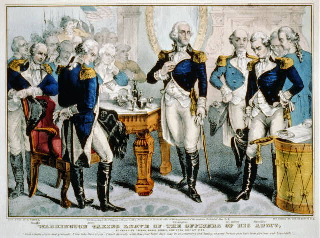 GW in NYC: “Washington taking leave of the officers of his army: Fraunces’ Tavern, Broad St., New York, Dec. 4, 1783.” Via Library of Congress Prints and Photographs Division. Image by N. Currier, ca. 1848