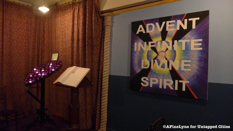 Above is a secondary alter honoring those who have died from AIDS and those who are still suffering worldwide. McDermott & McGough’s 1987 painting Advent Infinite Divine Spirit, is accompanied by a votive candle stand, and a book for visitors to inscribe tributes.