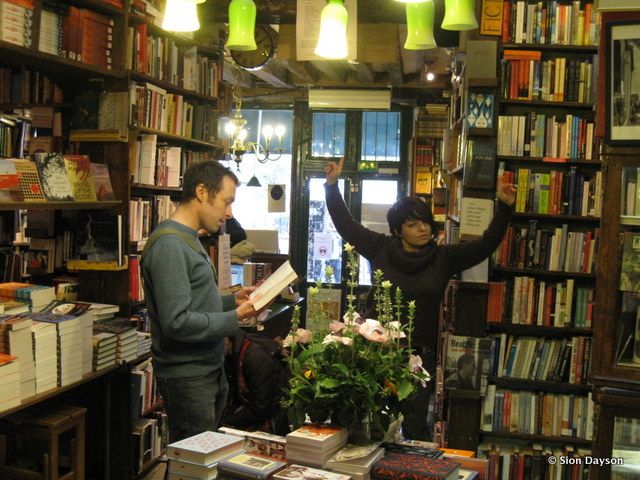 One of the new bookclerks (there’s always a rotating crew helping out in the store) went up to another staff member during the improv pause and after a large group of Italians had shuffled in then out, the place abuzz as usual.