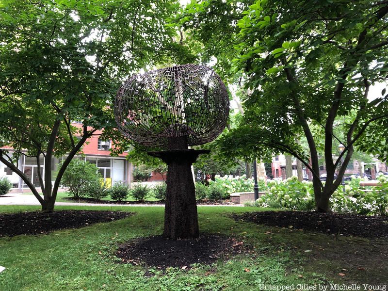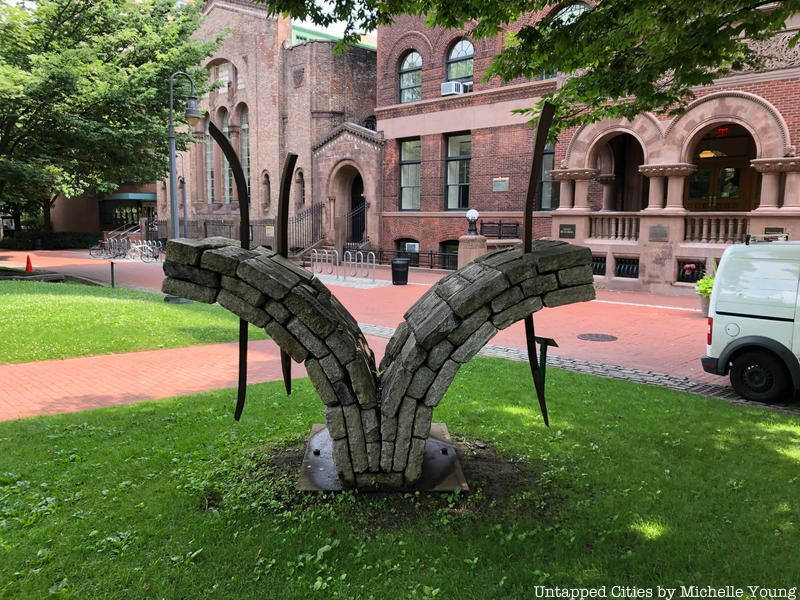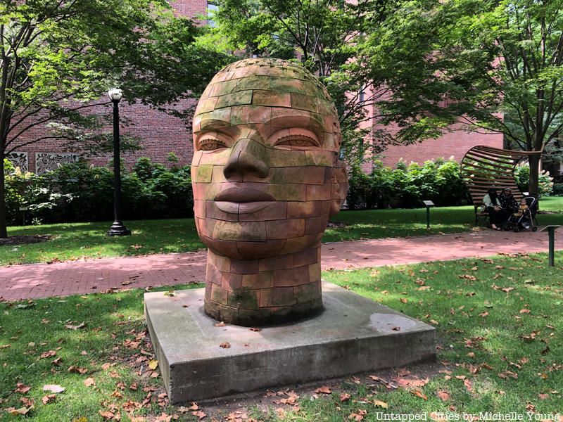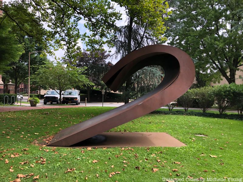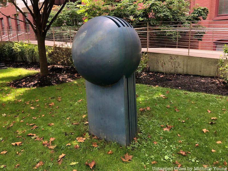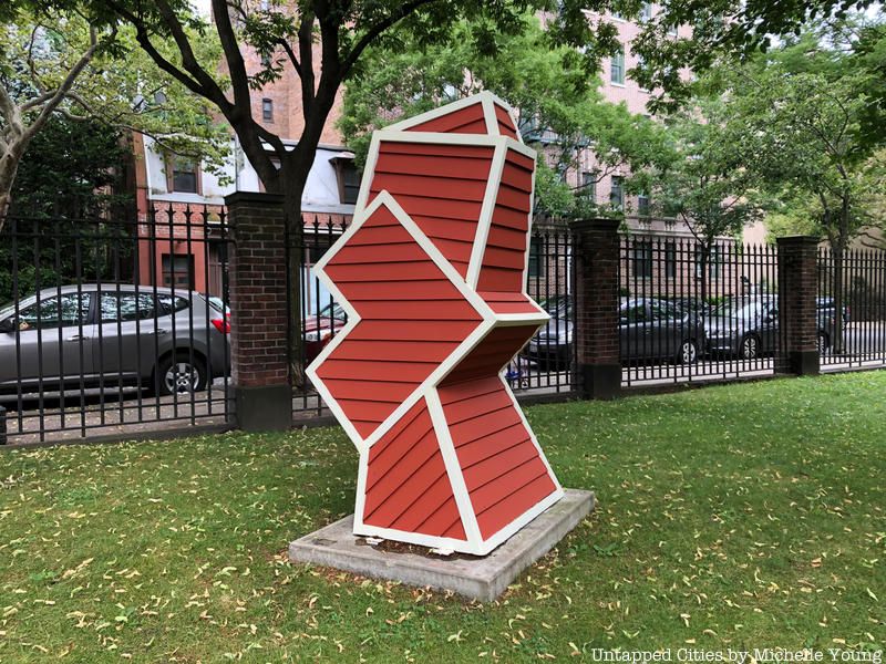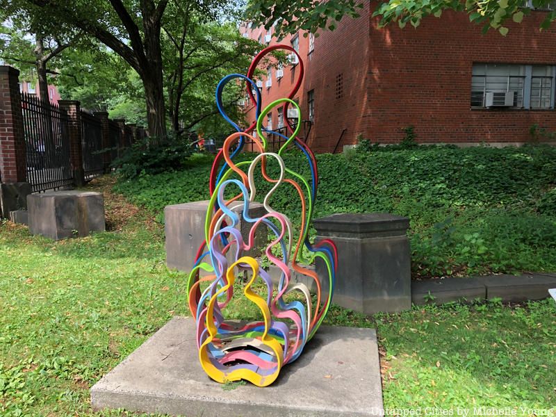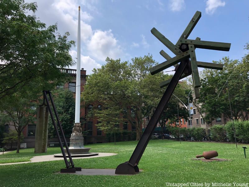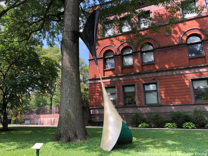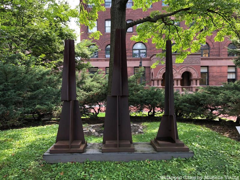 The fact that this sculpture park is free and open to the public falls in line with the original ethos of Pratt Institute, which was founded by industrialist Charles Pratt. His intent was to offer affordable education to everyone, and from the outset the school which opened in 1887 was open to students of any gender, class, or color. The curriculum focused on training for the industrial revolution, particularly in the fields of engineering and design.