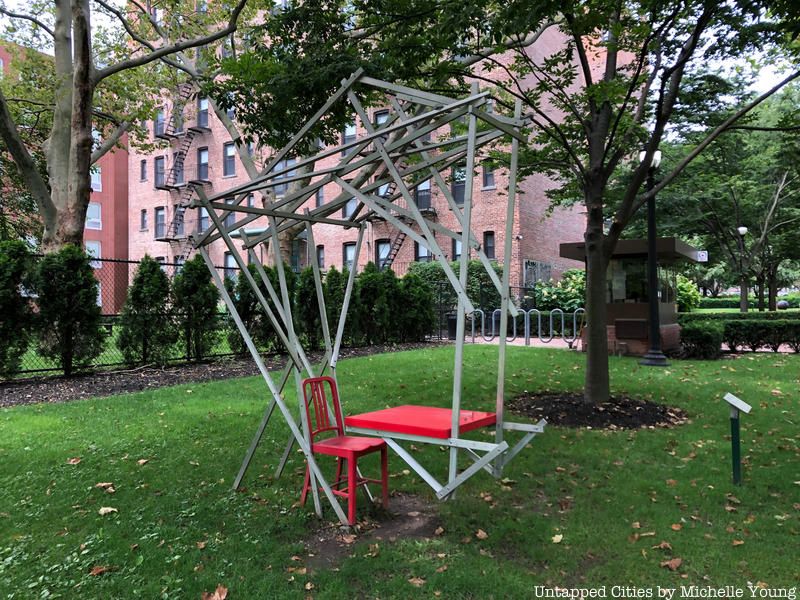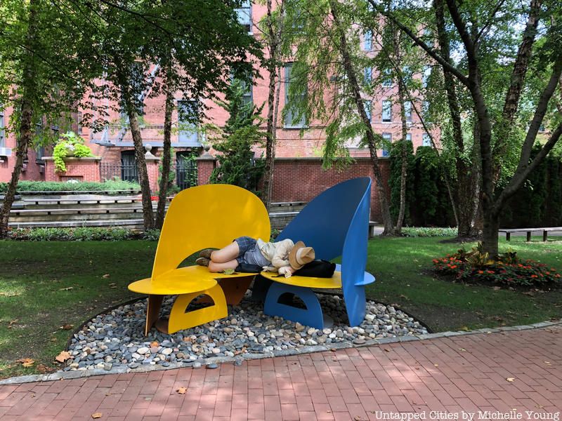 The bench works are certainly the most whimsical in the Sculpture Park. Tony Rosenthal, who created Astor Place’s famous Alamo Cube, has an untitled piece reminiscent of Mondrian and doubles as a bench. Alan Wexler’s Pratt Desk is inspired by puppeteering in which a hanging red desk is supported by metal scaffolding. Cathey Billian’s Whispering Bench — Texting takes a traditional park bench design but brings it to an extreme point, almost wrapping around itself. And George Sugarman’s Bench is so comfortable, a woman was full on taking a nap on our last visit.