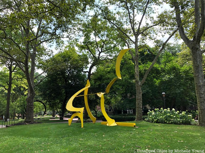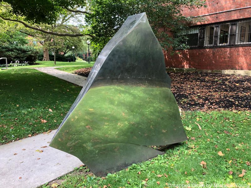 And that harmony is evident on a walk through the lush green campus, surrounded by stately brick buildings, as well as more modern ones. On a hot day, the tree canopy provides a respite from the surrounding urban grid. The sculptures are spread across three courtyards, but also sometimes tucked behind buildings or along the periphery of the campus. The works are on loan from faculty, graduates, and emerging artists. Some have already rotated out, including a rusted steel LOVE sculpture by Robert Indiana that was once there.