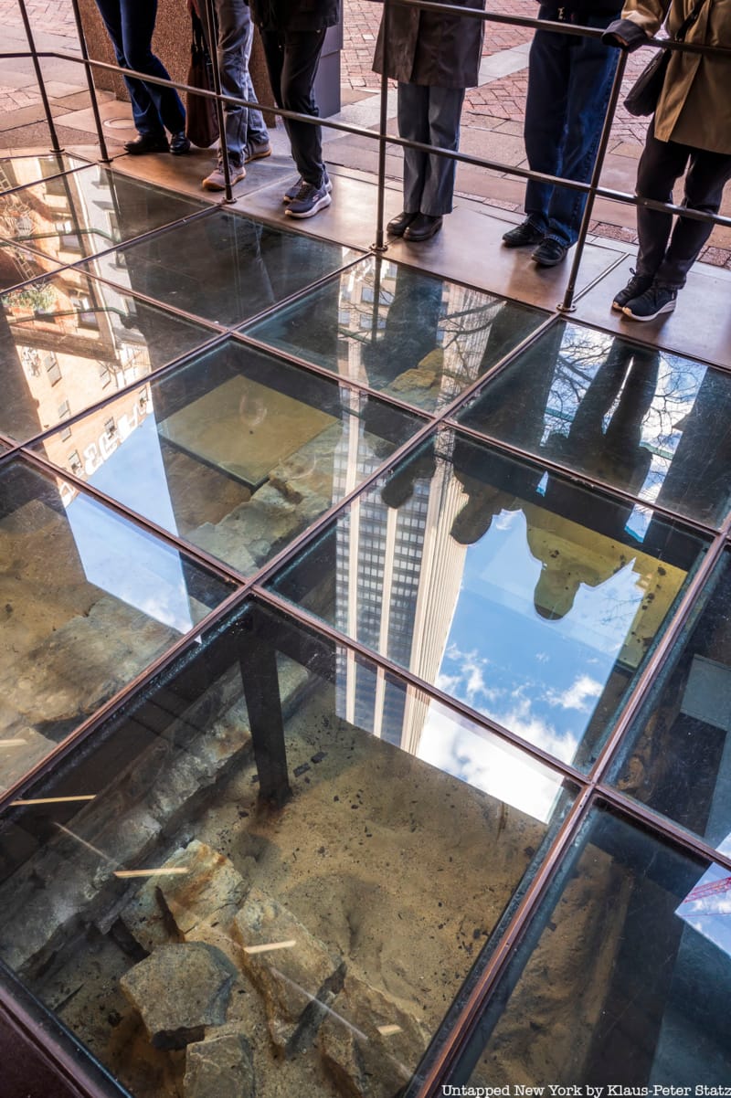 The original foundation walls of the Lovelace Tavern, dating back to the 17th century, can be seen through a glass window in the sidewalk at 85 Broad Street.