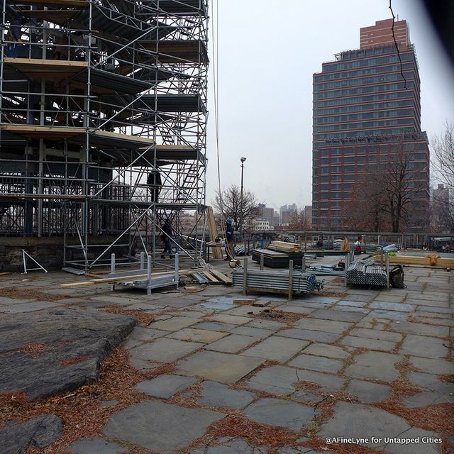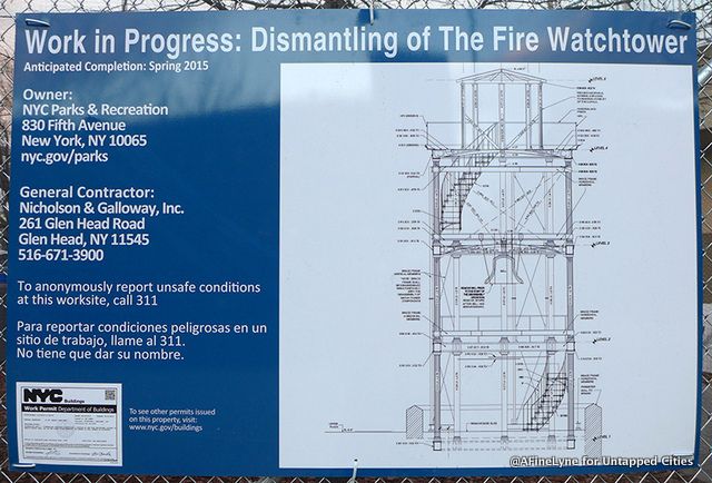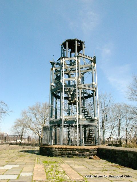 As the only surviving watchtower of the original thirteen dotting Manhattan, we have been paying particular attention to the much anticipated renovation of the Harlem Fire Watchtower. Built between 1855 and 1857, it was the only way to spot fires and sound an alert until electric telegraphs were installed in 1878. The watchtower is located at the highest part of the Acropolis in the center of Marcus Garvey Park, which was rebuilt as part of the WPA jobs program. The cast iron structure was built by Julius H. Kroehl and designed by James Bogardus at a cost of $2,300. The bell inside weights 10,000 pounds alone .