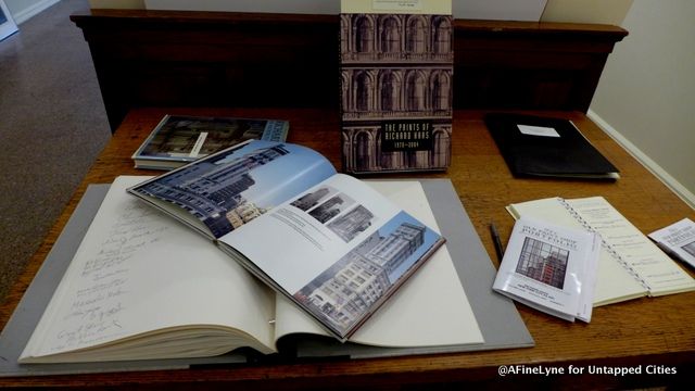 He authored two books, both on display during this exhibit: The City is My Canvas (2001) and The Prints of Richard Haas: A Catalogue Raisonne 1970-2004 (2005). The book below is open to a page showing his 1975 outdoor mural covering the bare brick wall of 112 Prince Street. Using paint, he mimicked a cast-iron facade. You can see the original bare wall on the top of the page on the left and below it, a partially completed trompe-l’Oeil.