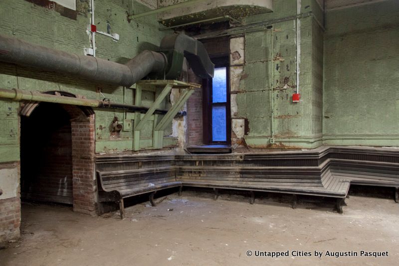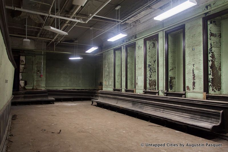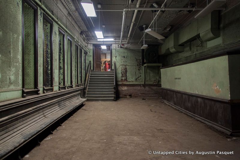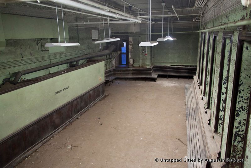There is a waiting room, pictured above that retains its tin walls and ceilings, green tinted paint job, and wooden wraparound bench. There was also once a wooden railing here, but it has been moved to the first floor of the armory, next to the Veterans Museum, an equally unknown spot. The words “EASTERN DISTRICT” printed on the left refer to the militia’s district within New York State.