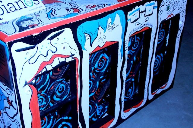 One of the most visually stunning pianos of the event was Brooke Pelczynski’s contribution, a piano covered in singing faces in bright blue, white, red, and black. The artist’s illustrations are indicative of her previous work.