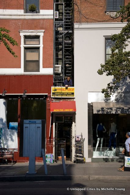 I’ve been living on the Upper West Side since the early ’90s when the area was not quite the vibrant corridor it is now. One of the curious developments in the urban fabric of Columbus Avenue are the skinny shops that exist between buildings. A while back ScoutingNY pointed out one of the skinniest magazine shops in New York, the Smoke Shop at 208 Columbus Avenue (pictured below, its official name is quite amazingly, the “Amazing Store & Smoke Shop.”). This isn’t a one-off occurrence however. The occupation of these narrow shops between buildings is part of a special zoning plan from the city of New York, which seems to have reinforced and/or extended already existing usages of in-between spaces along this avenue.