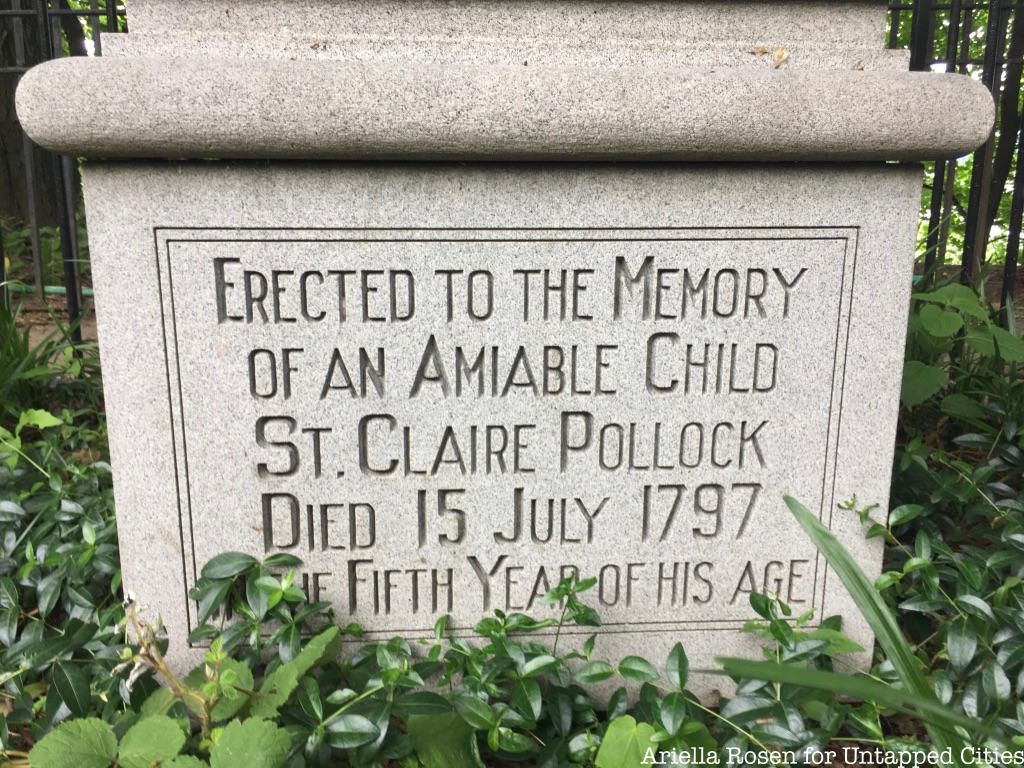 At the time of the burial, the property belonged to George Pollock, an Irish linen merchant who is generally thought to be either St. Claire’s father or his uncle. In 1800, however, economic losses forced Pollock to sell his land to his neighbor, Cornelia Verplanck, and he left the tomb of the “amiable child,” with its iron enclosure and marble monument in her care. Remarkably, the grave went undisturbed, even though the property changed hands many times before it was bought by the city in 1873 and turned into Riverside Park.