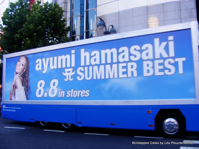 Japanese pop singers face lots of competition when trying to become famous and sell albums. One popular way to get attention is to use buses as moving billboards, with posters of their faces covering each side. Samples of music are played through speakers, letting people hear a glimpse of their songs.