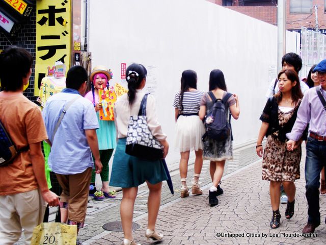 Takeshita Dori is a busy pedestrian street in the teen- and tourist-friendly neighborhood of Harajuku. Here, dozens of colorful shops sell all the elements required to create daring outfits. In order to attract people into their stores, employees stand outside, imploring them to come in for a look. Though some callers keep the volume low and may only be heard once within sight, others plead loudly, sometimes using microphones in order to drown out the voices of others. A melodious cacophony ensues.