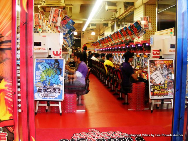 Pachinko arcade machines are a popular leisure activity in Japan. People go to the parlors to unwind for a few minutes, which frequently turn into a few hours. The unbelievably loud volume of the hundreds of machines placed side by side is nearly unbearable for newcomers but seems to become background noise once you’re entranced into the game. In the summer, the constant drone spills out onto the sidewalks, through open doors and windows.
