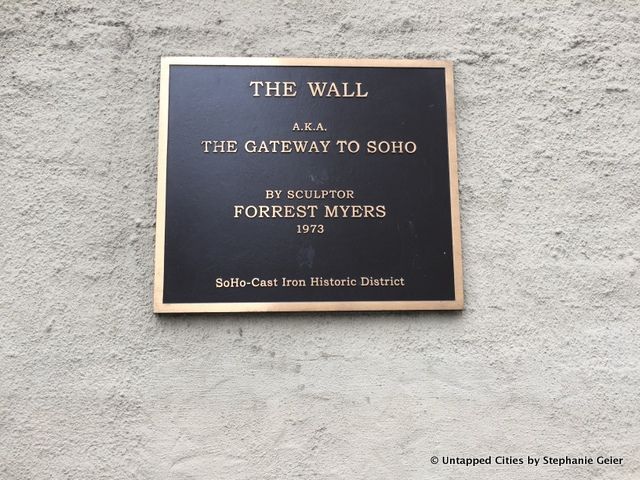 Forrest Myers constructed The Gateway to Soho in 1973 with 42 evenly spaced green aluminum bars attached to 42 steel braces. These pieces are set against a blue background covering about three-fourths of the building’s wall, representative of a type of wall that exists along Houston Street because of a street widening that removed rows of existing buildings. Gateway to Soho’s simple design yet large presence make it a minimalist work, commissioned by the building’s initial owner, Charles Tannenbaum, to cover the building’s unattractive joists.