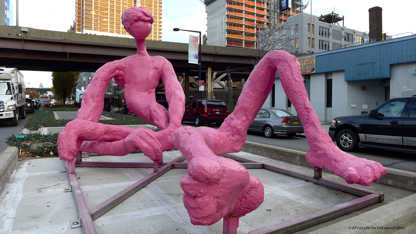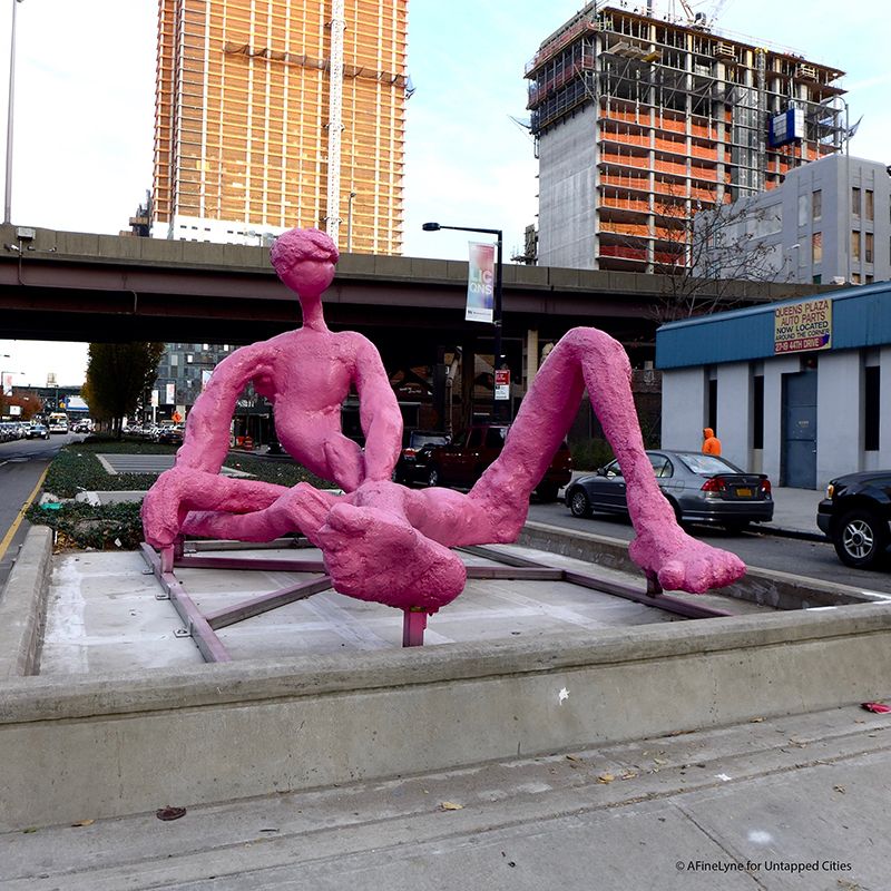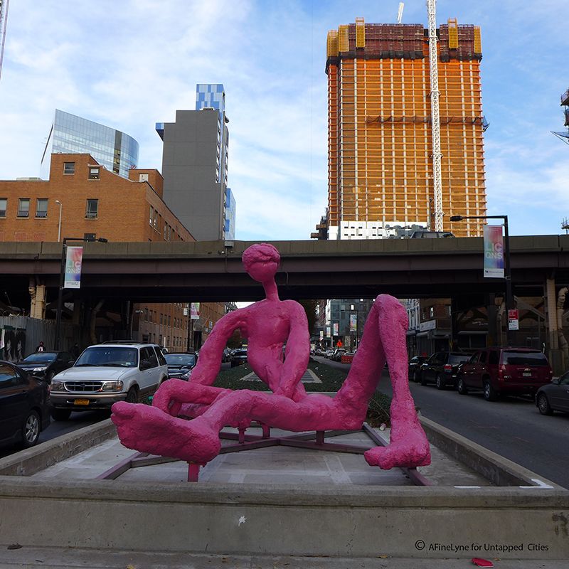 The much debated and long-awaited installation, The Sunbather, which is part of the Jackson Avenue Streetscape Project, has arrived in Queens. Created by artist Ohad Meromi, the 4,000 pound bronze installation was commissioned by the Department of Cultural Affairs through its Percent for Art Program. The whimsical figure stands nine-feet high and is painted an eye-popping, bubblegum shade of pink. It sits on a traffic median, surrounded by scores of new construction projects, and is part of a longterm plan for Jackson Avenue, which includes new lighting and improved road design.