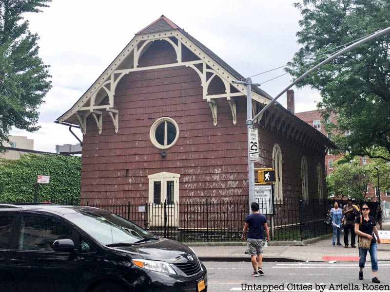 Old St. James Episcopal Church was a mission church built in 1735 on a parcel of land granted by the town of Newton (later renamed Elmhurst). The Colonial church was built in the style of a meetinghouse, with a rectangular form, wood shingles, round-arched windows, and a timber frame. The parish erected a new, larger church in 1848, just one block North along Broadway. The old church was abandoned in 1849, although it was still used on special occasions. The second oldest religious building in New York City, it was granted landmark status in 2017.