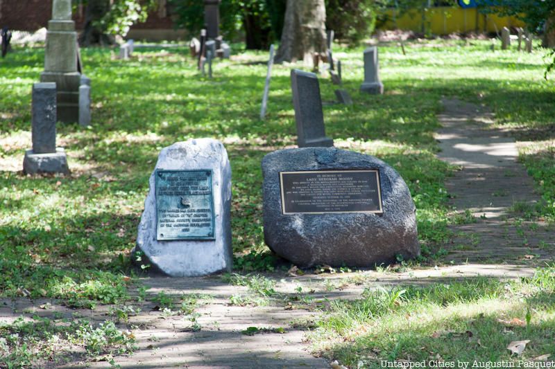 In the town plan of Gravesend, there were four quadrants within a 16 acre plot of land, each with ten houses surrounding a central common square. The common square in the southwest quadrant was used as the Gravesend Cemetery, which still exists today. Documents show that a cemetery was in operation here as early as 1650. Lady Moody herself is said to be buried in the cemetery, although her exact burial site is not known today. A plaque from the Gravesend Historical Society at the site notes that Revolutionary War soldiers are also buried here. Unfortunately, the gravestones from the 17th century are no longer there.