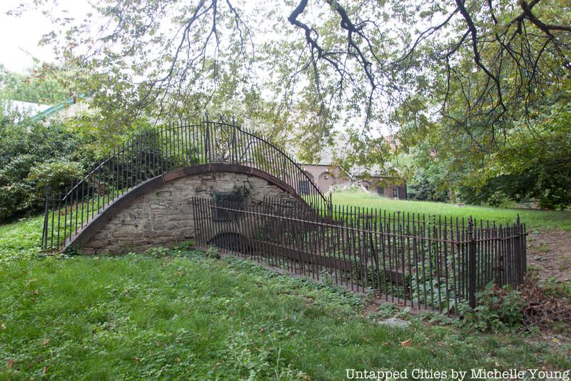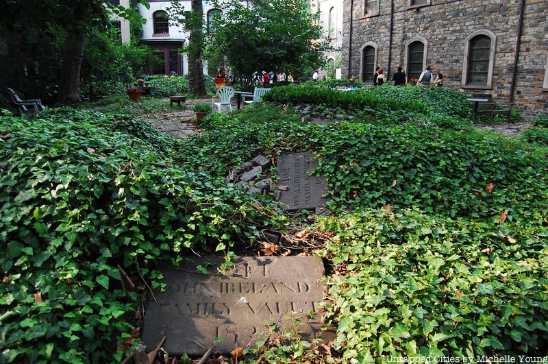 St. Mark’s Church in the Bowery is one of the oldest churches in all of New York City, and the second oldest in Manhattan. It has strong ties to the Stuyvesant family — Peter Stuyvesant built the first chapel that stood here in 1660 on what was his lrage farm. Peter and his kin are interred in the family vault underneath the church. The churchyard was dedicated to vault interments, and you can find numerous family vaults here. On our visit, we found names like Schermerhorn, Livingston, Tomkins, Suydam, and Sloughter, surrounded by ivy. The body of department store tycoon A.T. Stewart was stolen from a vault here leading to a sensational multi-year search.