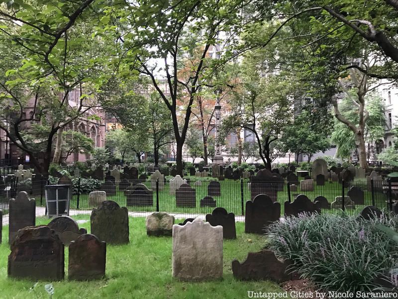 In 1697 when New York was under British control, the first Trinity Church was built. In 1703, the northern cemetery was given to Trinity Church with the provision that the city could keep using it as a public burial ground which it did so until 1821, when the city passed the ordinance banning burials south of Grand Street.