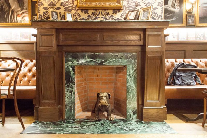 “Outside of the portraits and [book] jackets though,” Borgognone continued. “We wanted to restore the place and give it a little 1920s-centered glamour which we accomplished with the lighting, the marble frame on the fireplace, the leather banquets and the textured wallpaper.” Wondering about the bulldog in the fireplace? A former owner was a fan of bulldogs and the bronze sculptures are from that period, possibly a model of the owners’ actual dogs. Guests still come in and ask if the real bulldogs are still around, we’re told.