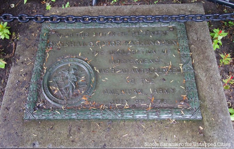 NEAR THIS SPOT IN THE PRESENCE OF GENERAL GEORGE WASHINGTON THE DECLARATION OF INDEPENDENCE WAS READ AND PUBLISHED TO THE AMERICAN ARMY JULY 9, 1776.
