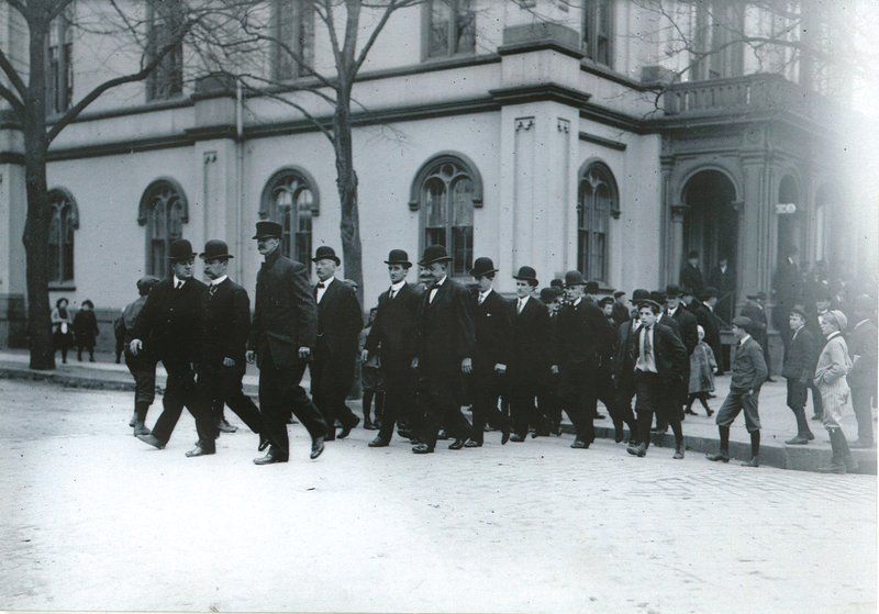 Crowds in front of Flushing Town Hall during the trial of Captain Peter Hains Jr. and Thornton Hains Jenkins. Photo courtesy Flushing Town Hall archives