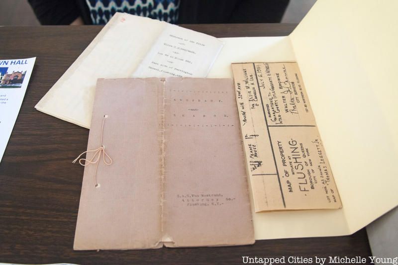 In the archives of Flushing Town Hall, the original deeds and affiliated documents for the Flushing Town Hall still exist. One document reviews the history of ownership of the property, including mortgage details, and another shows a map.