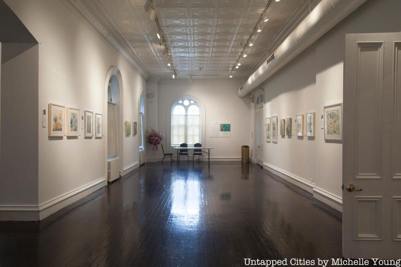 The gallery space on the first floor of Flushing Town Hall has served as both an office space and a jazz club. Historic photos show the walls completely covered in wooden slats with a tin coffered ceiling, which still exists. The transformation of spaces in Flushing Town Hall really reflect its long history of diverse use. Some of the back offices used to be a gallery, Kodadek says.