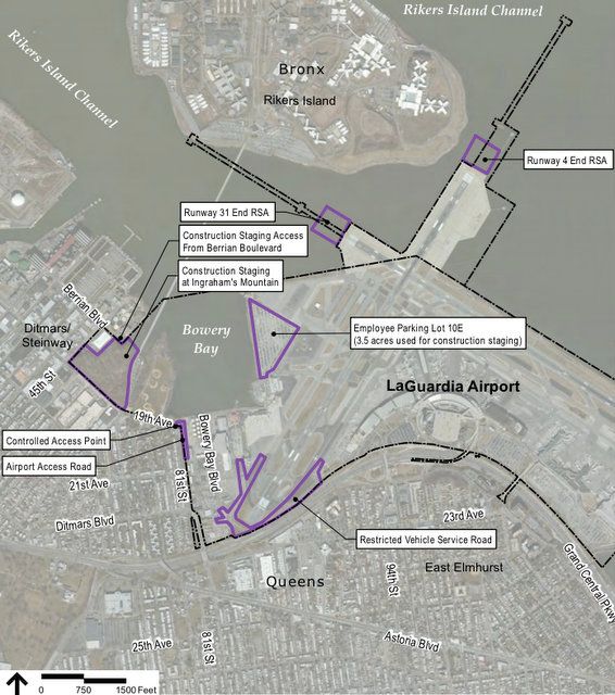 A Draft Environmental Assessment for LaGuardia Airport renovations was completed in August 2013 for public review and the public comment period ended a month later While the reason behind the extension is pretty standard airport safety stuff, it was the map that surprised us. One of the extended runways will basically touch Rikers Island, if the map in the report is accurate (hopefully not since it houses one of the world’s largest jails).