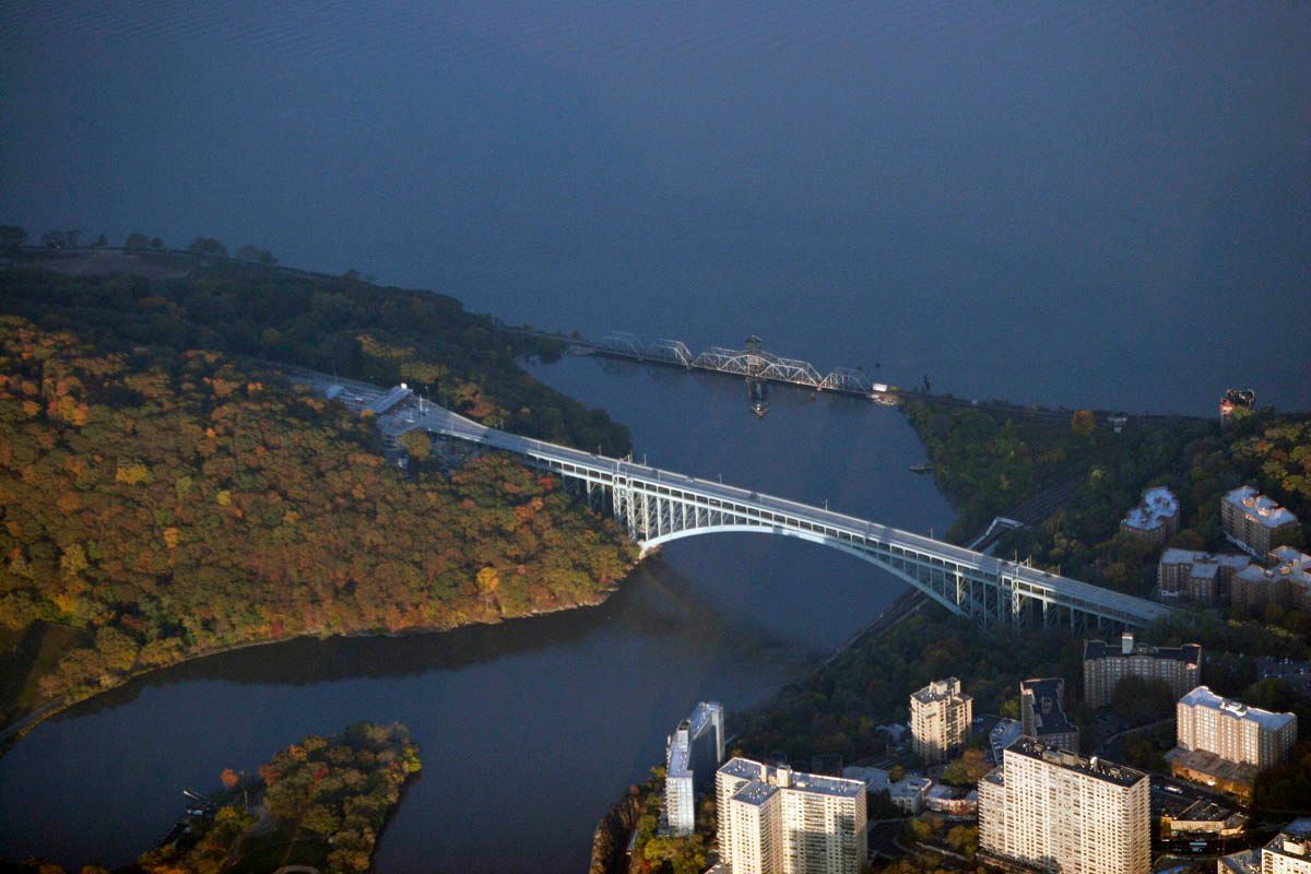 Designed by David B. Steinman and built as part of the Henry Hudson Parkway, the Henry Hudson Bridge was opened in 1936 to help alleviate congestion on the nearby Broadway Bridge. The steel arch toll span — named in honor of Henry Hudson’s voyage on the Half Moon, which was anchored near the site in 1609 — connects the Bronx with northern Manhattan, and spans the Spuyten Duyvil Creek.