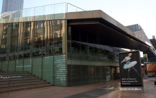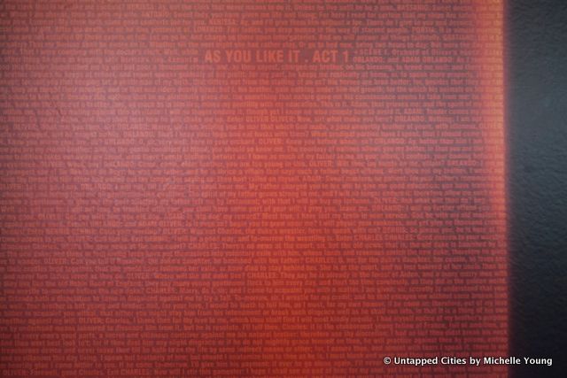 In 2014, JR wheat pasted not only the front of the David H. Koch Theatre, but installed a huge vinyl photograph of ballet dancers he photographed on the floor of the atrium. Meanwhile, inside the Juilliard School a wall that looks like a printout of a curtain is actually filled with quotes from Shakespeare if you look closely:
