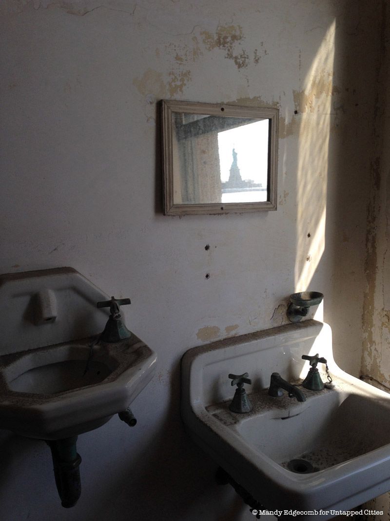 The “money shot” of the Ellis Island hospital complex is located inside one of the Isolation Wards on Island 3. By tilting your camera at just the right angle, you can capture the Statue of Liberty in the reflection of the still hanging mirror in the room. We won’t reveal the exact location, but the double sinks provide a hint of what the room was formerly used for.